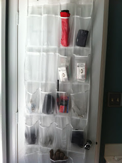 The other thing is simple storage. Items I need on occasion but not all the time. I needed an easy, but out of the way place to keep them, and keep them organized. The solution? A re-purposed over-the-door shoe rack: